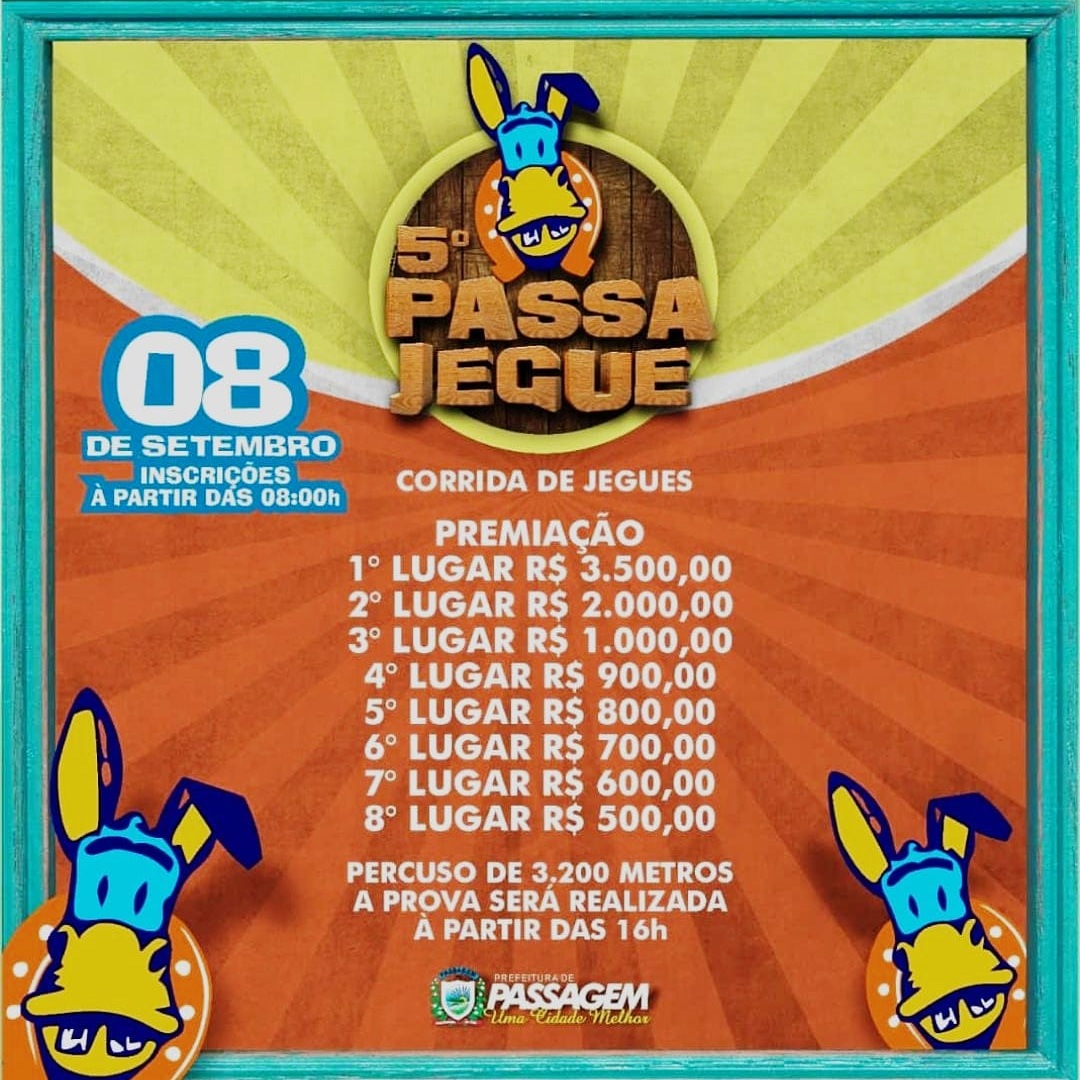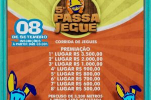 No dia seguinte, a Prefeitura também estará realizando o 5ª Passa Jegues, cujas inscrições ocorrem no dia do evento às 8 horas. O percurso será de 3.200 metros e a prova será realizada por volta das 16 horas.