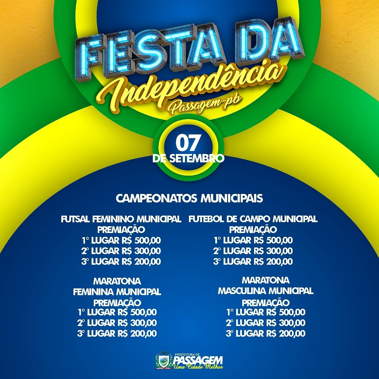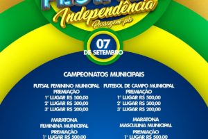 Dentro da programação, no dia 07, haverá campeonatos municipais de futsal feminino, futebol masculino e maratona feminina e masculina. O primeiro colocado em cada campeonato ganhará R$ 500,00; o segundo, R$ 300,00; e o terceiro, R$ 200,00.