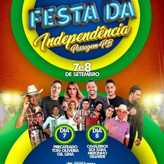 Acontece nos dias 7 e 8 de setembro, sábado e domingo, a Tradicional Festa da Independência, um evento marcante no município de Passagem, na região de Patos. No sábado acontece as apresentações musicais de Precateado, Ton Oliveira e Gil Lima; e no domingo se apresentam com Cavaleiros, Boi Kara, Mercinho e Giliarde