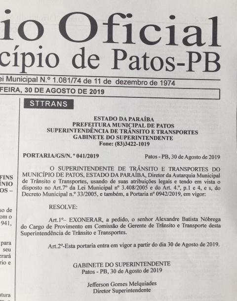 A exoneração de Alexandre Nóbrega está publicada no Diário Oficial do Município de Patos do dia 30 de agosto, mas, a imprensa só tomou conhecimento do fato nesta segunda-feira (02).