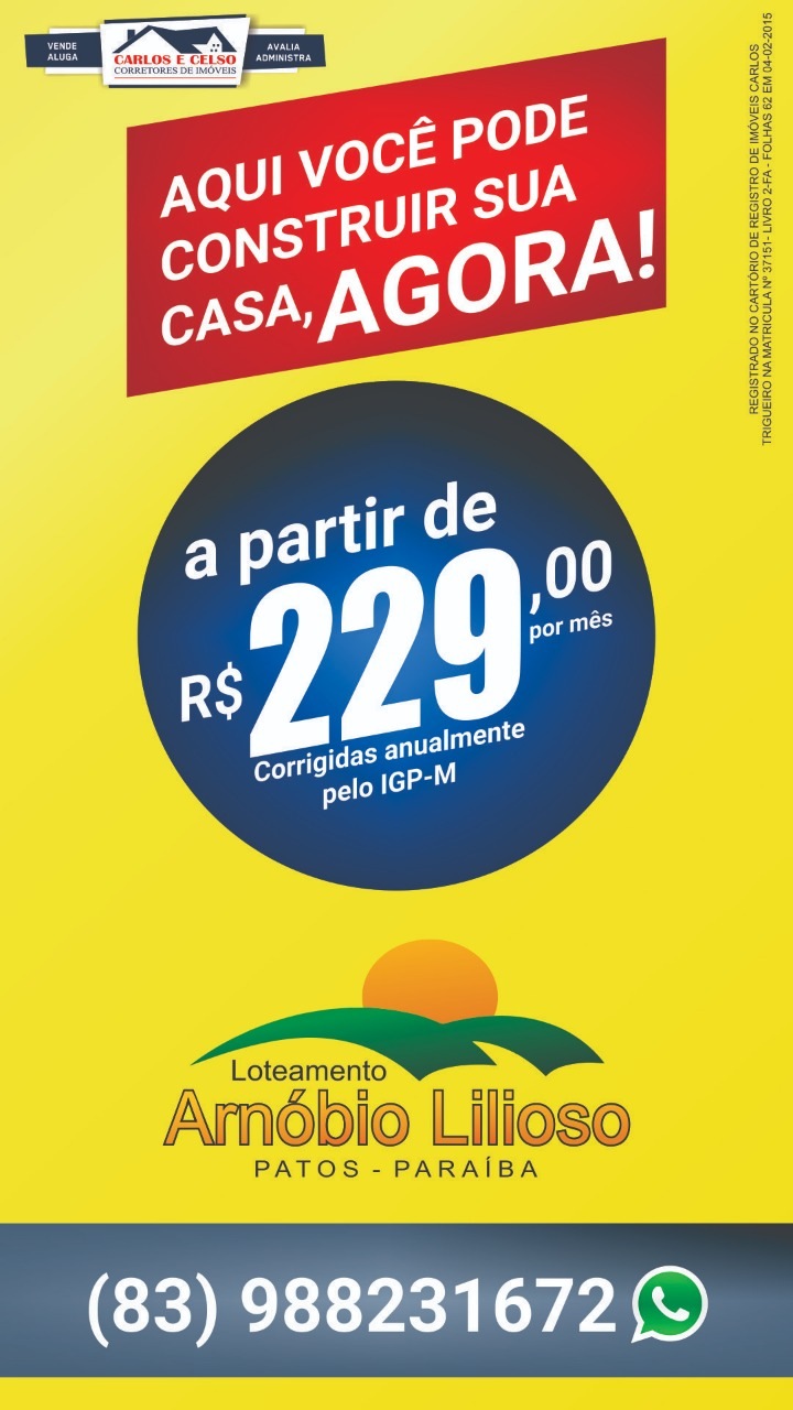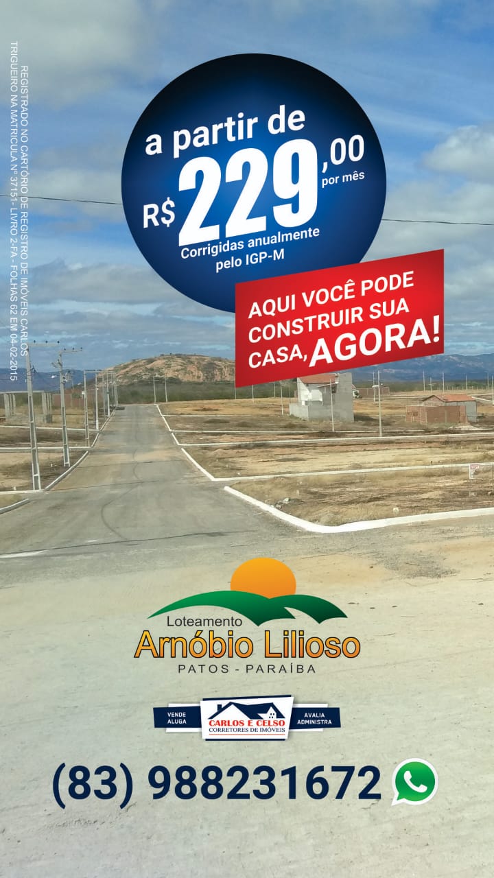 O Loteamento Arnóbio Lilioso, situado às margens da BR-361, na saída para Piancó, em Patos, está preparado para você erguer sua residência com toda a infraestrutura necessária.