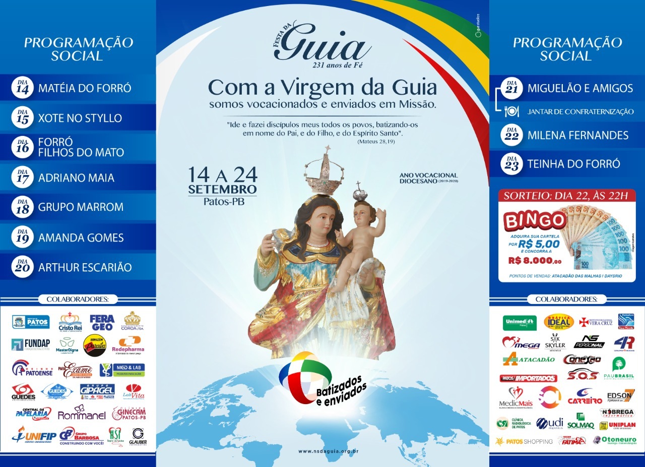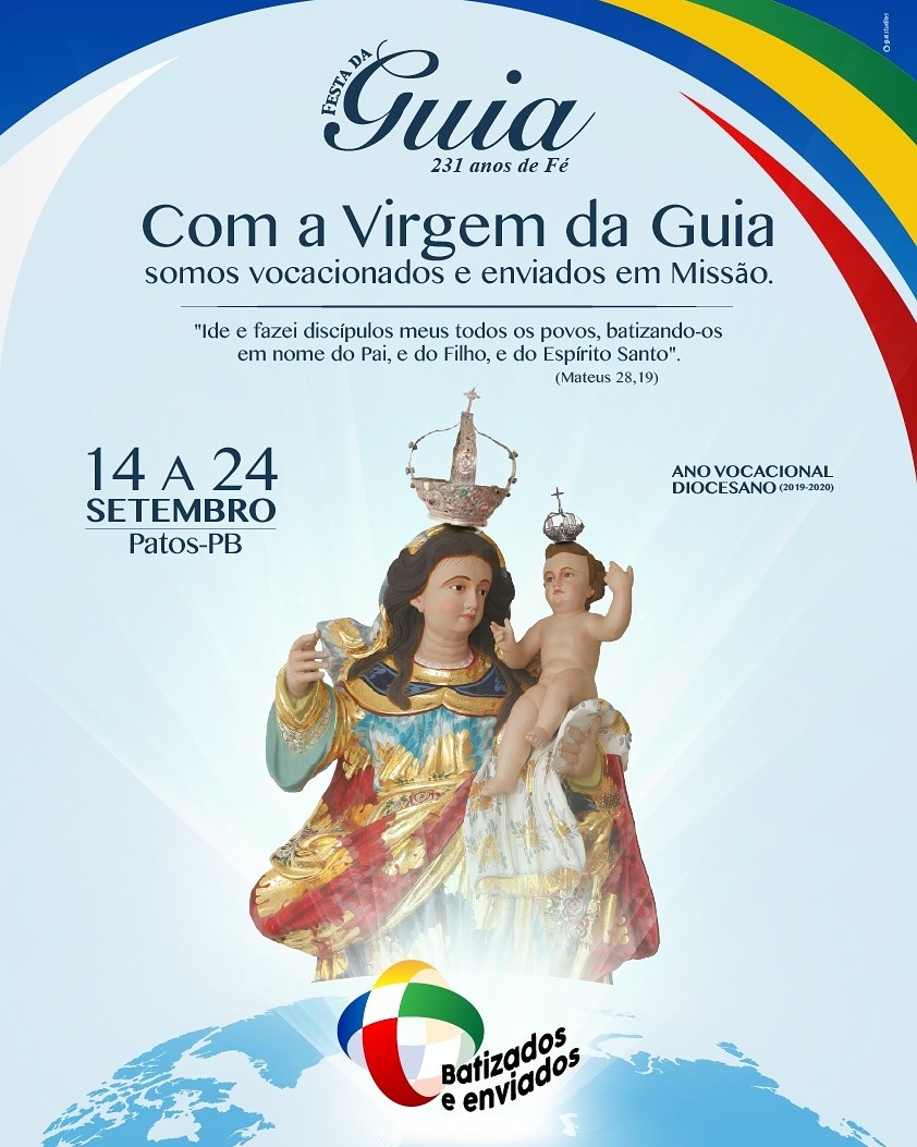 Terá início no próximo sábado, 14, com uma grande carreata saindo às 17h da Paróquia de São Pedro no bairro do Jatobá, em Patos, a abertura da Festa da Guia 2019, com o tema “com a Virgem da Guia somos vocacionados e enviados em missão”, e o lema: ide e fazei discípulos meus todos os povos, batizando-os em nome do Pai, do Filho e do Espírito Santo” (Mateus 28,19).