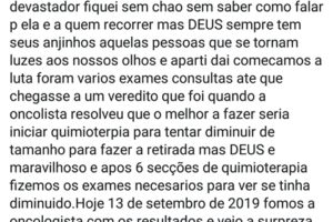 Depois de passar por seis sessões de quimioterapia ela se submeteu a uma ressonância magnética a pedido da oncologista Nayarah Castro, onde foi constatado que ela está livre da doença, motivo de muita alegria para ela e a família. “Agradecemos a toda a equipe do Hospital do Bem e a Deus por dar a graça da cura à minha mãe”, disse a filha Danny Rodrigues.
