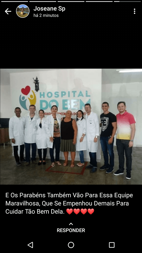 Depois de passar por seis sessões de quimioterapia ela se submeteu a uma ressonância magnética a pedido da oncologista Nayarah Castro, onde foi constatado que ela está livre da doença, motivo de muita alegria para ela e a família. “Agradecemos a toda a equipe do Hospital do Bem e a Deus por dar a graça da cura à minha mãe”, disse a filha Danny Rodrigues.
