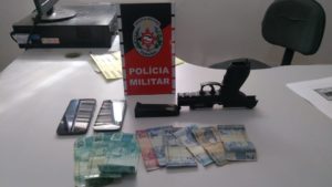 Instantes depois, foram identificados e presos pela guarnição do trânsito, os J. J. O. S. e o J. C. V. Todos os objetos roubados foram recuperados, incluindo além dos celulares uma quantia de 315,00 reais.