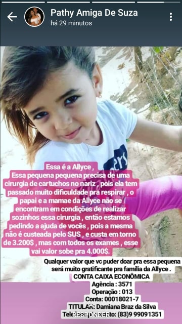 A filha do casal Maycon e Damiana, que residem no distrito Manguenza, em Nova Olinda, a pequenina Alycce Ayalla braz Rodrigues de Souza, de 5 anos de idade, está precisando realizar uma cirurgia de “cartucho do nariz”.