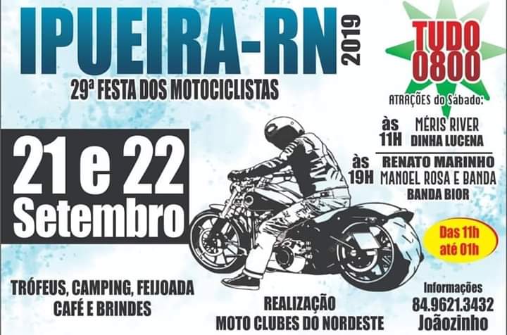 Começa nesta sexta-feira, 20, e vai até domingo, 22, a 29ª Festa dos Motociclistas, no município de Ipueira, na região de Caicó, no Rio Grande do Norte. O tradicional evento é uma realização do Moto Clubes do Nordeste e terá atrações musicais, troféus, camping, feijoada, café e brindes.