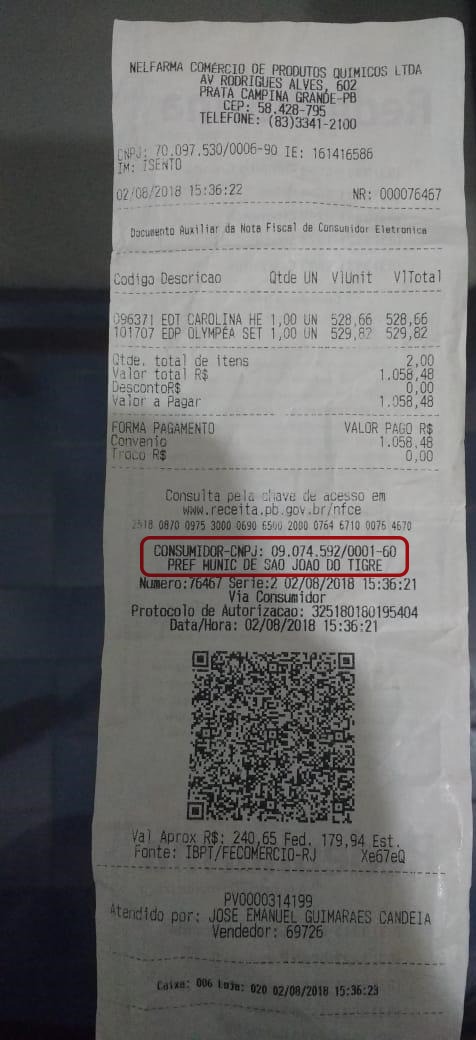 Recursos do Fundo Municipal de Saúde de São João do Tigre, no Cariri Paraibano, foram utilizados para a compra de dois perfumes importados em uma farmácia de Campina Grande. A compra custou R$ 1.058,48 e o nome do Fundo Municipal de Saúde consta na nota fiscal emitida, o que possibilitou o rastreamento do uso indevido dos recursos.