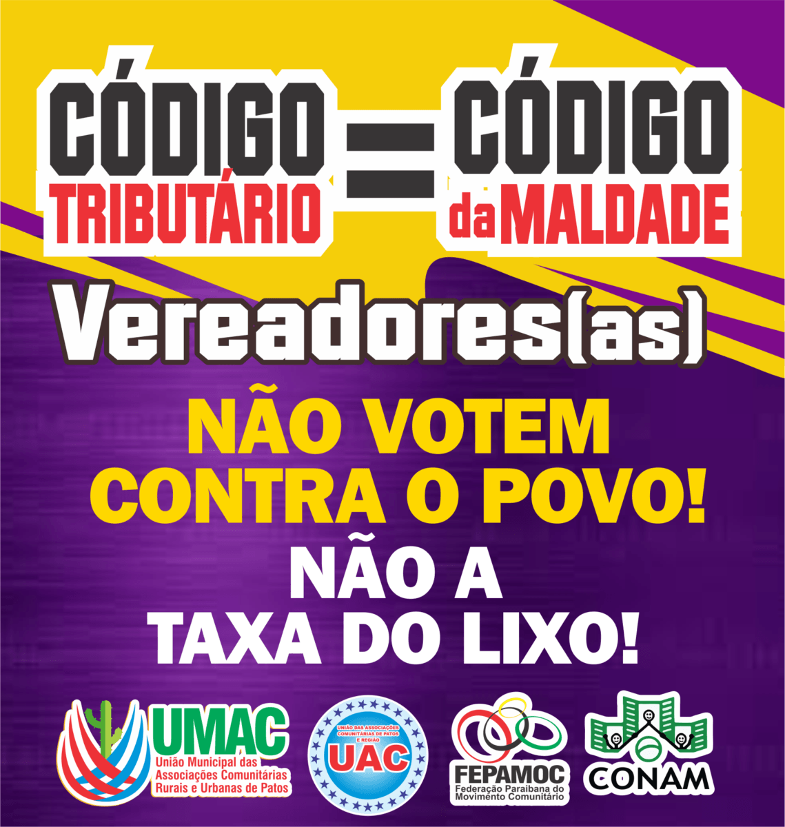 Diversas entidades estão se mobilizando para comparecerem a Câmara Municipal de Patos para protestarem contra a aprovação do Código Tributário de Patos que foi enviado pelo vereador e Prefeito Interino de Patos, Ivanes Lacerda.