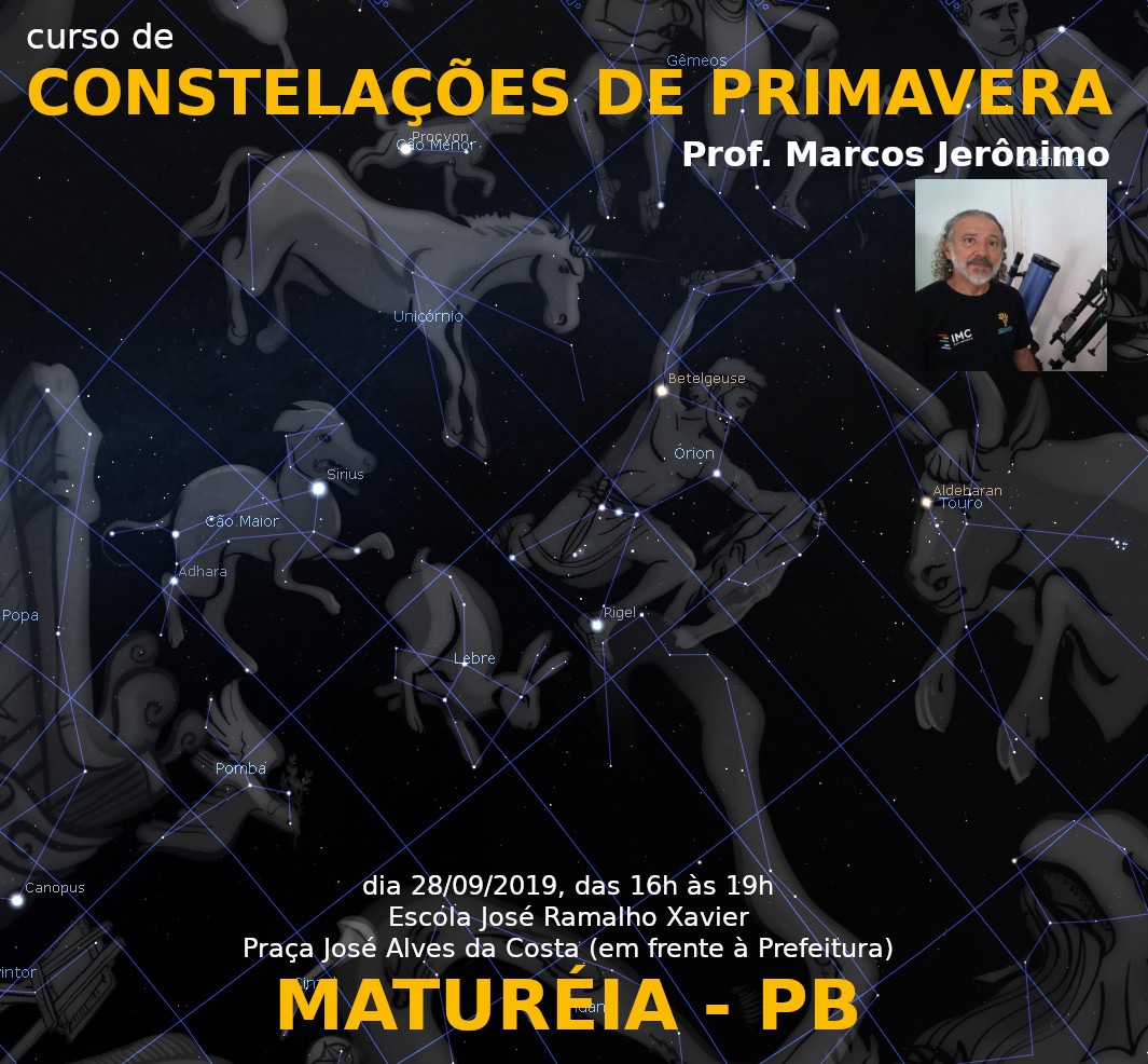 Sábado, dia 28 pela tarde, o professor Marcos Jerônimo, da APA, ministrará um minicurso de astronomia básica voltada para identificação das constelações da primavera. O curso é voltado para voltado para professores, estudantes e para o público em geral que tem interesse em aprender mais sobre a astronomia observacional. (Interessados entrar em contato pelo telefone (83) 99979-9802.