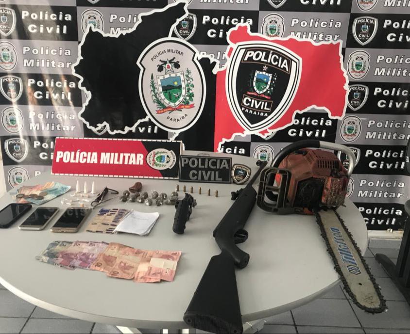 – J. P. da S., Vulgo Zominho, que foi preso em flagrante com 12 porções de substância vegetal análoga a maconha e a quantia de R$ 310, 00, uma espingarda de pressão sem a nota fiscal e um moto serra também sem nota fiscal;