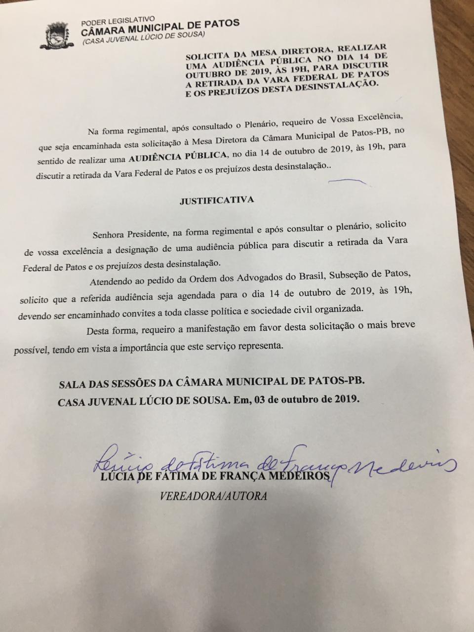 Na noite desta quinta-feira, 03/10, o Plenário da Câmara de Vereadores aprovou requerimento da vereadora Lucinha Peixoto (PC do B) para realização de Audiência Pública para discutir a problemática da retirada da Vara Federal de Patos e os prejuízos que poderão advir com a desinstalação.