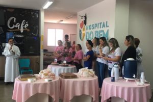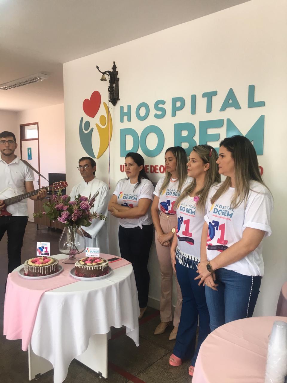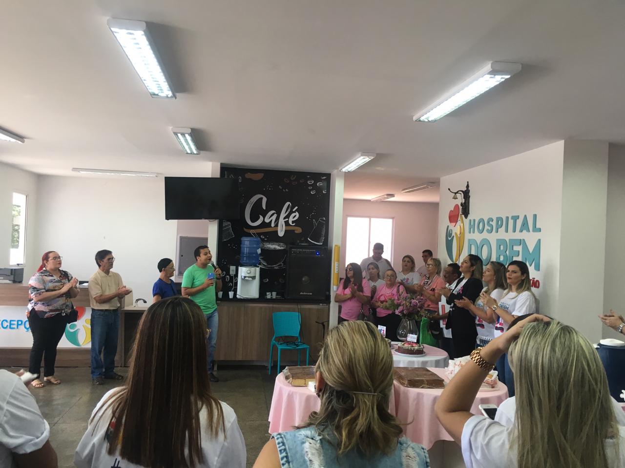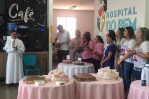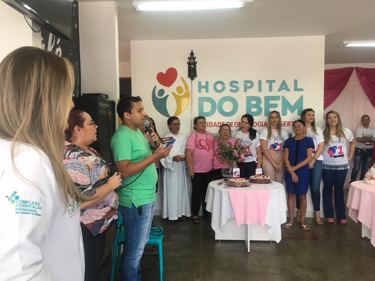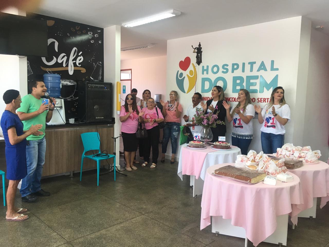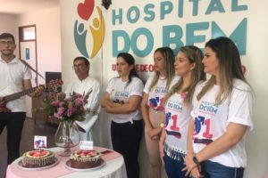 A comemoração de um ano de atividades do Hospital do Bem – unidade oncológica que faz parte do Complexo Hospitalar Regional Deputado Janduhy Carneiro de Patos, aconteceu na manhã desta segunda-feira (07). O momento foi marcado com um louvor do diácono José Tadeu Rodrigues, com sessões de maquiagem para pacientes, uma ação em alusão ao Outubro Rosa, com toques de sino por pacientes que alcançaram a cura, com voz e violão e ainda por um lanche coletivo partilhado por funcionários, pacientes e integrantes da ONG ‘Amigas Viva a Vida’. Tudo aconteceu no hall de entrada da unidade, que estava decorado com elementos e cores numa alusão ao Outubro Rosa, e contou com a presença da Secretária Executiva de Saúde, Renata Nóbrega, da diretora geral, Liliane Sena e da diretoria da Santa Casa de Birigui, que administra o Complexo.