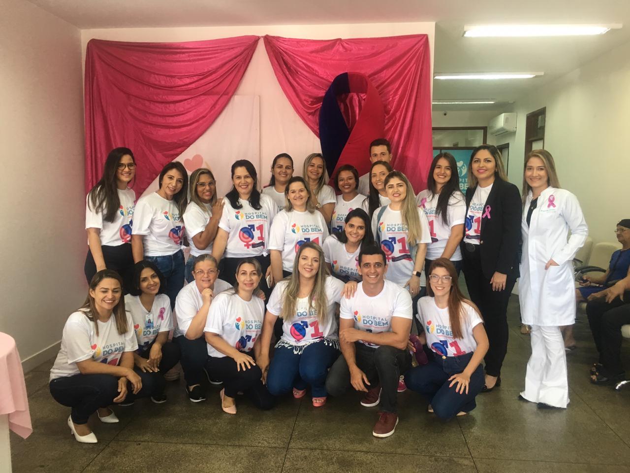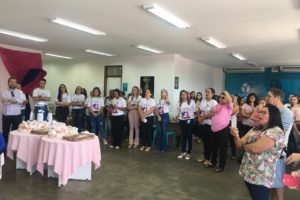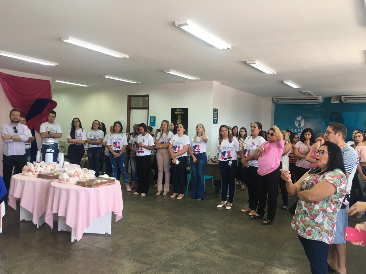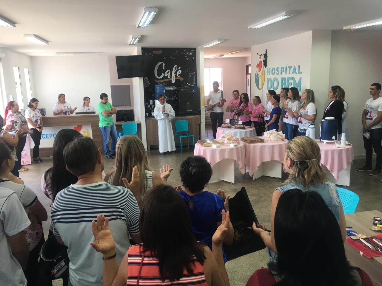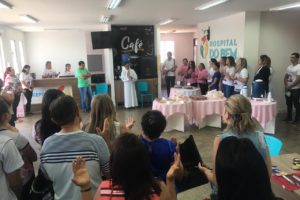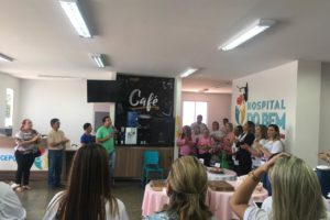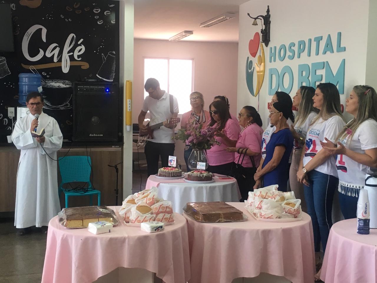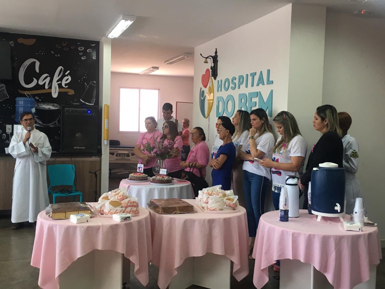 A comemoração de um ano de atividades do Hospital do Bem – unidade oncológica que faz parte do Complexo Hospitalar Regional Deputado Janduhy Carneiro de Patos, aconteceu na manhã desta segunda-feira (07). O momento foi marcado com um louvor do diácono José Tadeu Rodrigues, com sessões de maquiagem para pacientes, uma ação em alusão ao Outubro Rosa, com toques de sino por pacientes que alcançaram a cura, com voz e violão e ainda por um lanche coletivo partilhado por funcionários, pacientes e integrantes da ONG ‘Amigas Viva a Vida’. Tudo aconteceu no hall de entrada da unidade, que estava decorado com elementos e cores numa alusão ao Outubro Rosa, e contou com a presença da Secretária Executiva de Saúde, Renata Nóbrega, da diretora geral, Liliane Sena e da diretoria da Santa Casa de Birigui, que administra o Complexo.