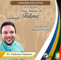 O padre Fabrício Timóteo celebrará missa às 19 horas desta quarta-feira, 09, na Festa da Paróquia de Nossa Senhora de Fátima, no bairro Belo Horizonte, em Patos.