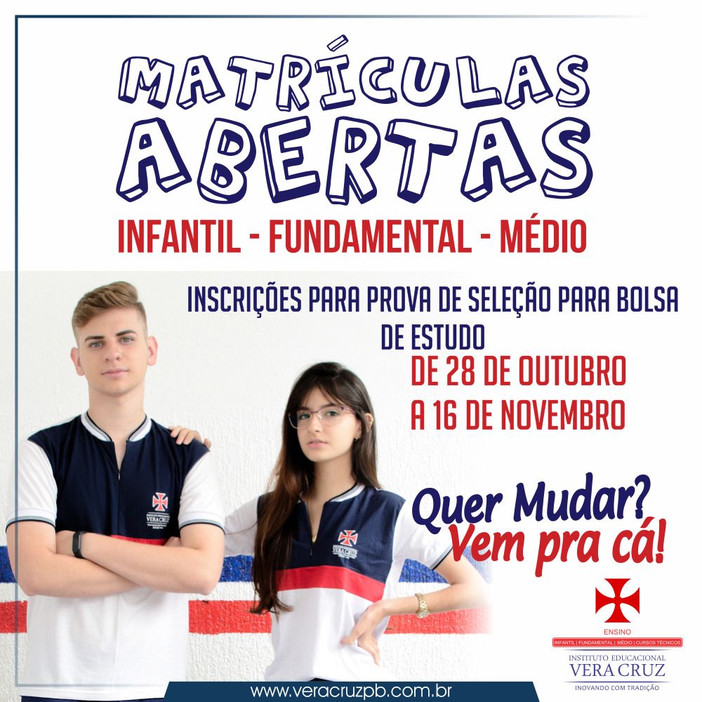 O Instituto Educacional Vera Cruz, lança sua campanha de matrícula para o ano letivo de 2020 com inscrições para bolsa de estudo, que vão do dia 28 de outubro ao dia 16 de novembro.
