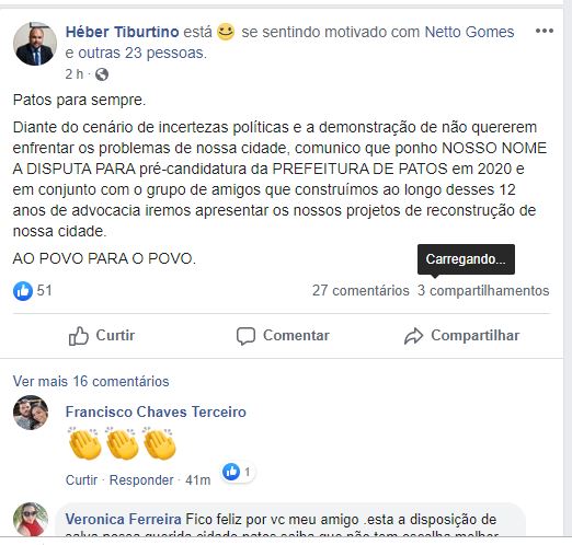 Logo após a divulgação de nota oficial do deputado Érico Djan (PPS) renunciando a sua pré-candidatura a prefeito da cidade de Patos, o advogado Héber Tiburtino divulgou em suas redes sociais um texto afirmando a sua pré candidatura a prefeito da cidade de Patos em 2020.