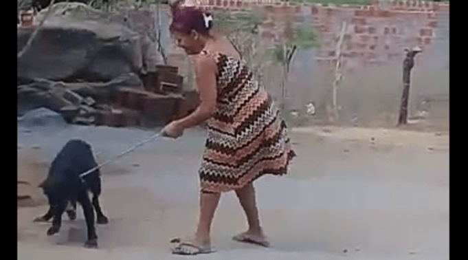 Nas imagens, uma mulher aparece matando o animal com uma faca, enquanto segura o cão amarrado por uma corda.