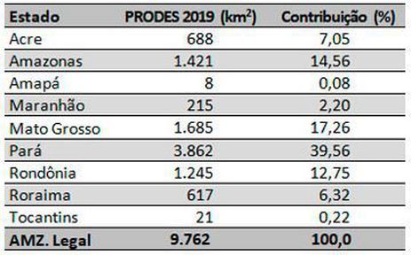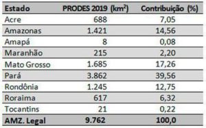 De acordo com o alerta do Sistema de Detecção de Desmatamento em Tempo Real (Deter), que monitora diariamente a área amazônica, a previsão de desmatamento em 2019 seria de 6,8 mil km². Entretanto, o relatório do Prodes mostrou que 9.762 km² de área de vegetação nativa foram destruídos. De acordo com os registros do Inpe, o índice é o maior desde 2008 (quase 13 mil quilômetros de mata devastada).