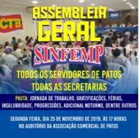 A Presidente do Sindicato dos Funcionários Públicos Municipais de Patos e Região – SINFEMP, no uso de suas atribuições que lhe confere o art. 8º, Letra d, como também o Art. 13º, letra b, do Estatuto Social, convoca todos os SERVIDORES PÚBLICOS DO MUNICÍPIO DE PATOS – PB, para se reunirem em ASSEMBLEIA GERAL EXTRAORDINÁRIA a ser realizada no dia 25 de novembro de 2019, segunda-feira , às 17:00 horas, em primeira convocação, e, às 17:30 horas, em segunda e última convocação, no Auditório da Associação Comercial de Patos, situado na Rua José Gomes Alves, 91, Centro, Patos – PB, com a seguinte pauta: 1 – Jornada de trabalho dos servidores municipais, 2 – Pagamento em dia dos salários; 3 – Implantação da Insalubridade; 4 – Implantação das Progressões Horizontais e Verticais; 5 – Entrega de EPI – Equipamento de Proteção Individual; 6 Redução do Adicional Noturno, 7. Retirada de gratificação dos servidores, 8. – Assédio moral nos locais de trabalho; 09 – Condições dignas de trabalho; 10- – Indicativo de Paralisação e ou Greve por tempo indeterminado; 11 – Calendário de Mobilização; 12 – Indicação dos membros para composição do Comando de Greve; 13 – Definição de Calendário dos 30% de funcionamento dos serviços essenciais conforme determina a Lei. Patos – PB, 20 de novembro de 2019.