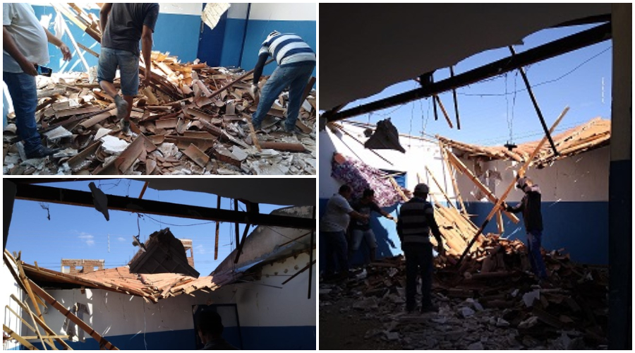 O teto da Escola Municipal Professor Manoel de Sousa Oliveira, em Patos,, desabou na noite desta quarta-feira (20). Não havia ninguém no local.