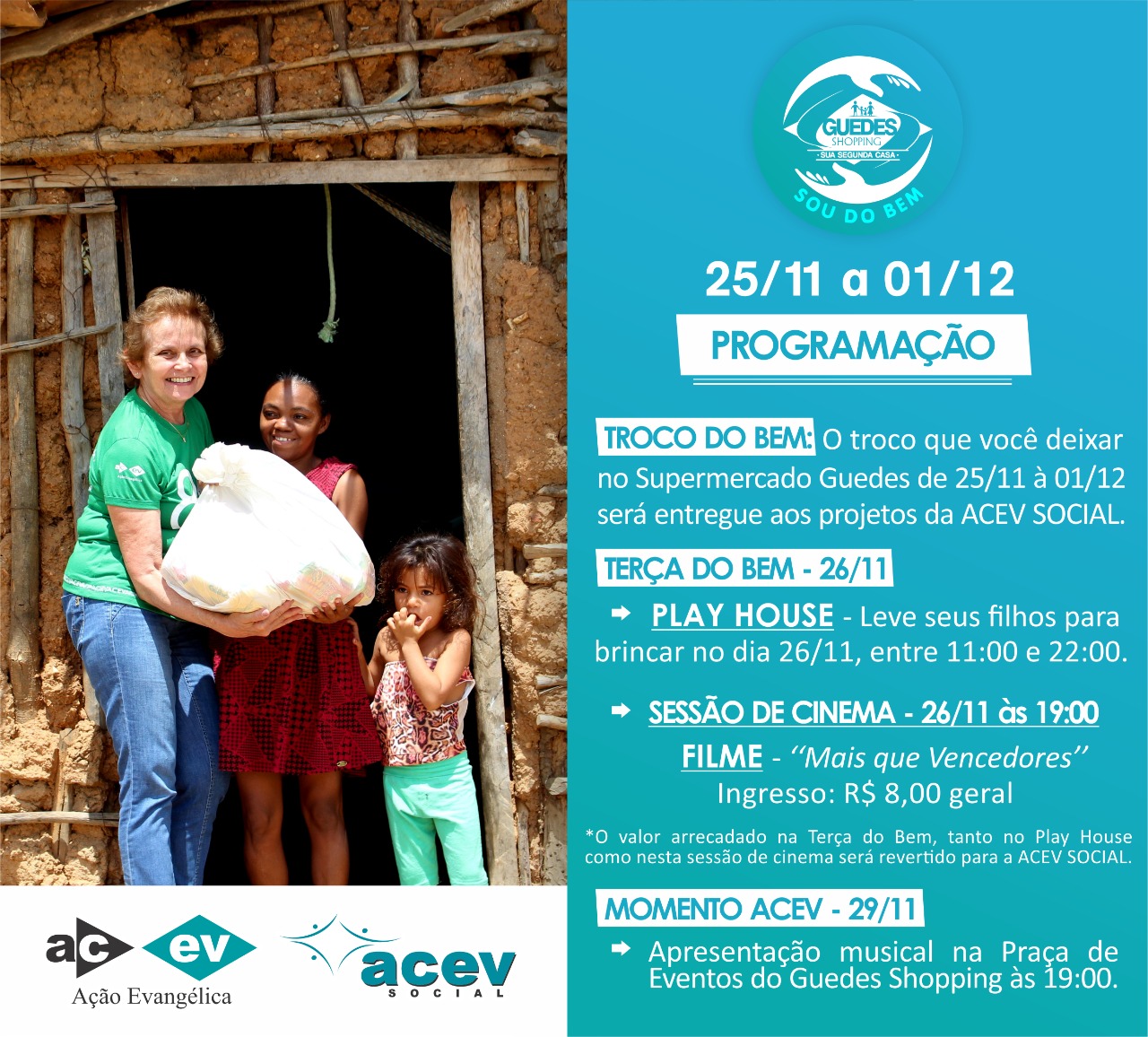 Cada semana uma instituição diferente é contemplada e a partir desta segunda-feira 25, até o dia 01 de dezembro, o troco que você deixar no Supermercado Guedes será entregue aos projetos da ACEV Social, que realiza importantes ações nas comunidades carentes de toda a região, entre elas o Projeto Flor do Sertão, Projeto Poços, Projeto Plantação, Projeto 4 Pernas, Projeto Produção de Mel, Projeto Biodigestor, Projeto Banheiros Comunitários, Projeto Pão Nosso, Projeto Alimentação e Programa Ação Educar.