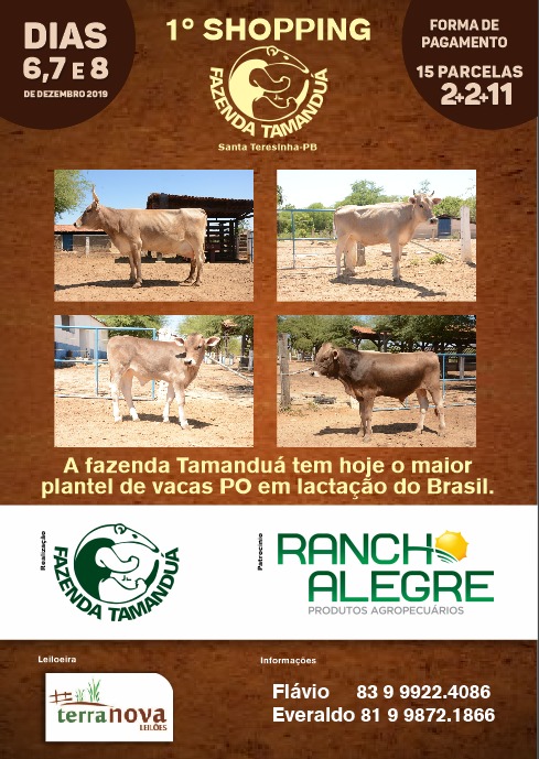 A fazenda Tamanduá realizará, nos dias 6, 7 e 8 de dezembro, o primeiro Shopping de Gado de Elite, em sua sede, no município de Santa Terezinha (PB), com 80 animais registrados, entre vacas novilhas e tourinhos. Os pagamentos poderão ser efetuados em 15 prestações.