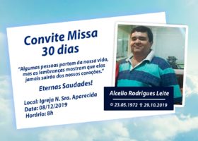 A família de Alcelio Rodrigues Leite convidam parentes e amigos para a Missa de 30 dias em sufrágio de sua alma neste domingo, 08, às 8 horas, na Igreja de Nossa Senhora Aparecida, no Jardim Guanabara, em Patos; e agradece a todos que comparecem a este ato de fé e solidariedade cristã.