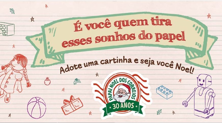 Há 30 anos, os empregados dos Correios, comovidos com as mensagens escritas em letrinhas recém-aprendidas ou transformadas em desenhos coloridos que chegavam até a empresa, decidiram começar a tirar esses sonhos do papel. Nascia aí uma das campanhas de solidariedade mais queridas pelos brasileiros: o Papai Noel dos Correios. Entre os pedidos das crianças há cesta básica, bola, comida, boneca, bicicleta, tablets, celulares, material escolar, sandália, roupa, calçado. Agora, é só escolher a cartinha e ser o Papai Noel.