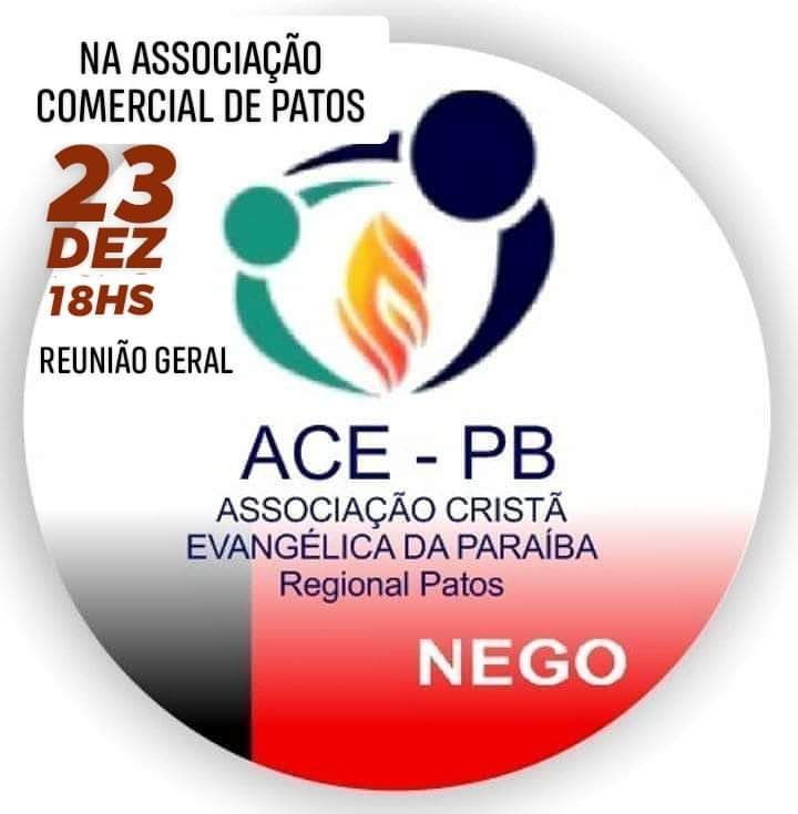 Na próxima segunda-feira, 23, às 18 horas, na Associação Comercial de Patos, será realizada a reunião geral (última reunião do ano) da Associação Cristã Evangélica da Paraíba (ACE-PB)/Regional Patos, com seguinte pauta a ser abordada: