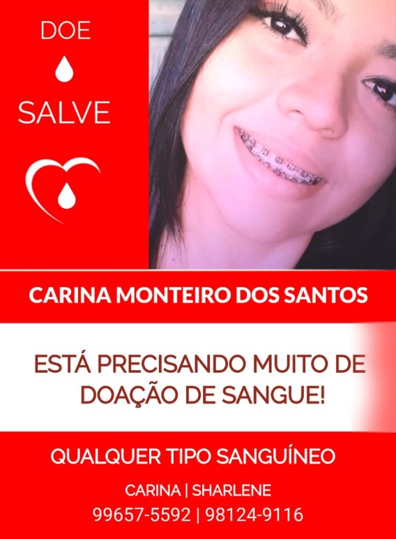 Se você deseja ajudar, vá até o hemonúcleo de sua cidade e faça sua doação de sangue (qualquer tipo sanguíneo) para Carina Monteiro dos Santos.