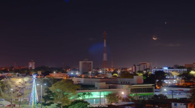 Na noite deste sábado, 28, o astrofotografo e astrônomo Marcelo Zurita registrou a bela conjunção entre Lua e Vênus. A foto foi feita no Bairro da Torre, em João Pessoa.