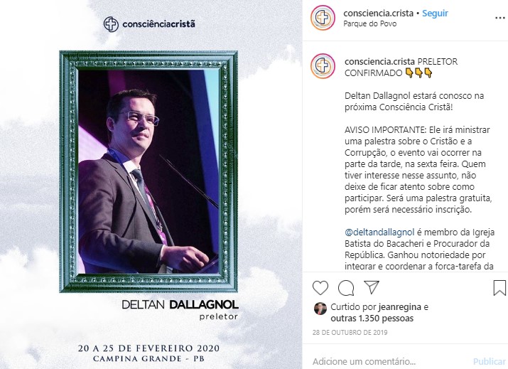 O coordenador da Lava Jato, Deltan Dallagnol será um dos palestrantes do evento 22ª Consciência Cristã – O Retorno do Rei, na cidade de Campina Grande, na Paraíba. Deltan será responsável por ministrar a palestra gratuita intitulada como o”Cristão e a Corrupção”.