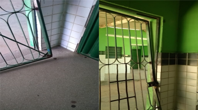 A Escola Municipal José Eias de Amorim não tem alarme e não obtivemos informações sobre a presença do vigia na unidade escolar. Fotos de celular feitas por funcionários mostram um dos portões da escola quebrado na manhã de hoje.