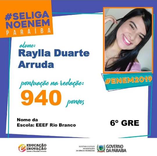 A jovem de Teixeira, Raylla Duarte Arruda, de 17 anos, fez 940 pontos na redação do ENEM 2019, cujo tema foi “Democratização do acesso ao cinema no Brasil”. O resultado está sendo divulgado nesta sexta-feira, 17. A aluna concluiu o ensino médio na Escola Rio Branco, em Patos.