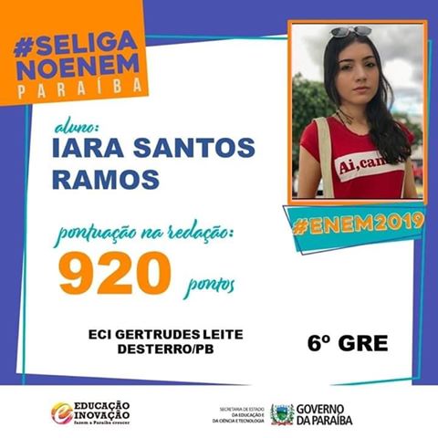 A jovem Iara Santos Ramos, de 17 anos, do município de Desterro, Região Metropolitana de Patos, obteve 920 pontos na redação do ENEM, cujo tema foi “Democratização do acesso ao cinema no Brasil”. O resultado foi divulgado nesta sexta-feira, 17.
