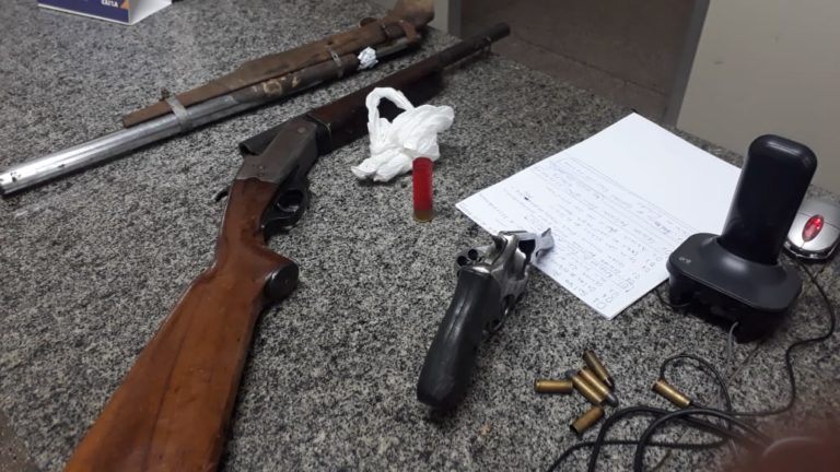Duas escopetas calibre. 12 foram apreendidas, além de um revólver. O comandante não descarta a possibilidade de mais armas terem sido usadas no crime. O casal de reféns saiu ileso na troca de tiros.