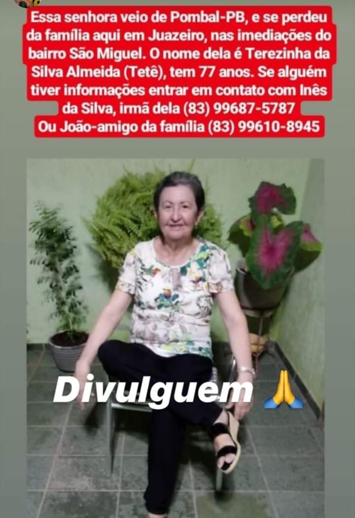 A senhora Terezinha da Silva Almeida, conhecida como Tetê, de 77 anos, de Pombal, se perdeu da família nas imediações do bairro São Miguel, em Juazeiro do Norte-CE. Ela é tia de Aldo Nunes, que foi diretor do SEBRAE de Patos.