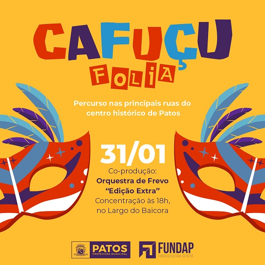 Pela primeira vez, com muito bom humor e alegria, o Cafuçu Folia será realizado na cidade de Patos. A folia está marcada para acontecer nesta sexta-feira, 31 de janeiro, com concentração no largo do Baicora, a partir das 18h, e percorrerá as principais ruas históricas da cidade com animação da Orquestra de Frevo ‘Edição Extra”.
