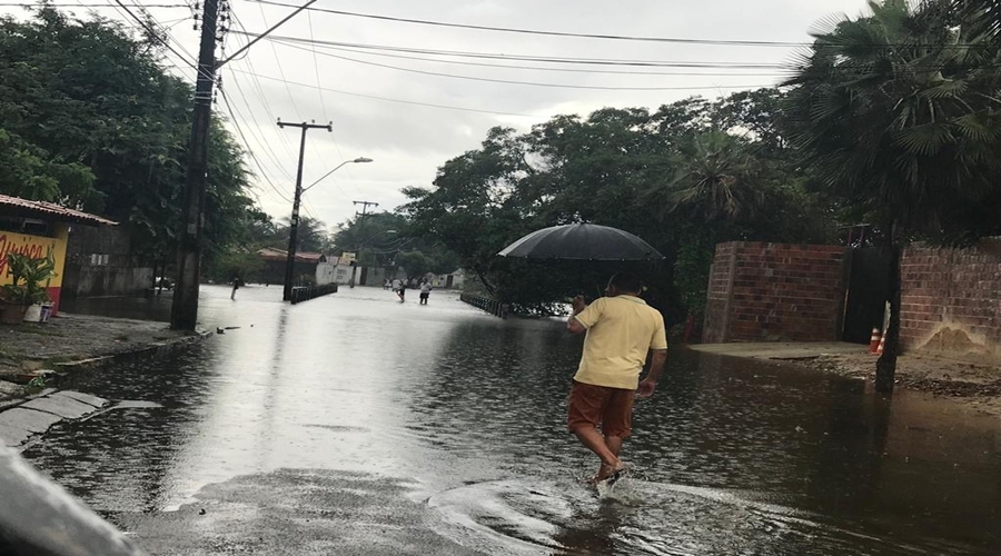 Em Caucaia, na Região Metropolitana de Fortaleza, moradores flagraram a Avenida Contorno Leste alagada devido à chuva que atingiu o bairro Nova Metrópole.