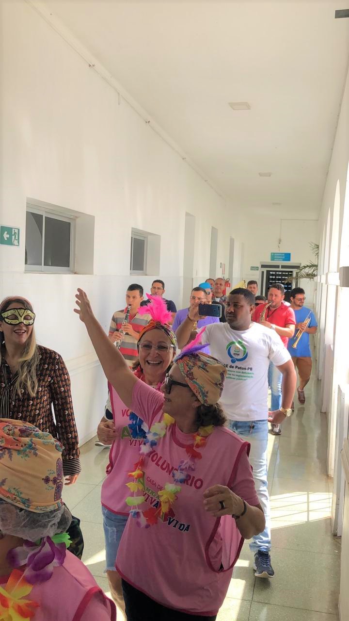 No Hospital do Bem, de Patos, a tristeza não faz morada e o que impera é a alegria, a esperança, o amor, a empatia e, sobretudo, a humanização. E foi a partir dessa vivência cotidiana de que a rotina da unidade vai muito além dos medicamentos prescritos, das consultas realizadas, dos tratamentos e cirurgias realizadas que, no começo da manhã desta quarta-feira (19), pacientes, colaboradores e acompanhantes foram surpreendidos com um grito de carnaval, com direito a bandinha de frevo passando por vários setores da unidade, seguido de um momento de conversa sobre a importância da alegria na terapêutica dos pacientes e, por fim, um lanche coletivo. A ação também foi realizada nas dependências do Complexo Hospitalar Regional Deputado Janduhy Carneiro, ao qual o Hospital do Bem está integrado.