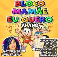 Na próxima terça- feira, 25/02, o Bloco Infantil Mamãe Eu Quero, estará completando seis anos e, na ocasião,reunirá toda a criançada de São José de Espinharas. O evento é organizado por Socorro Abreu.