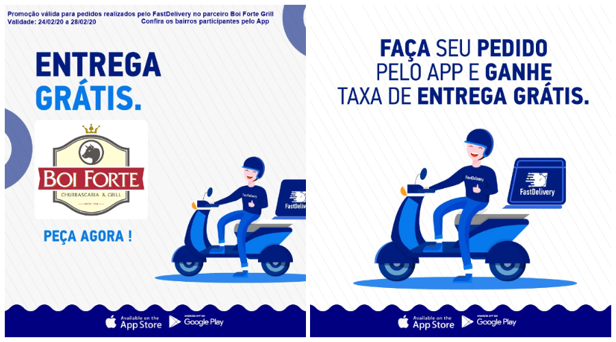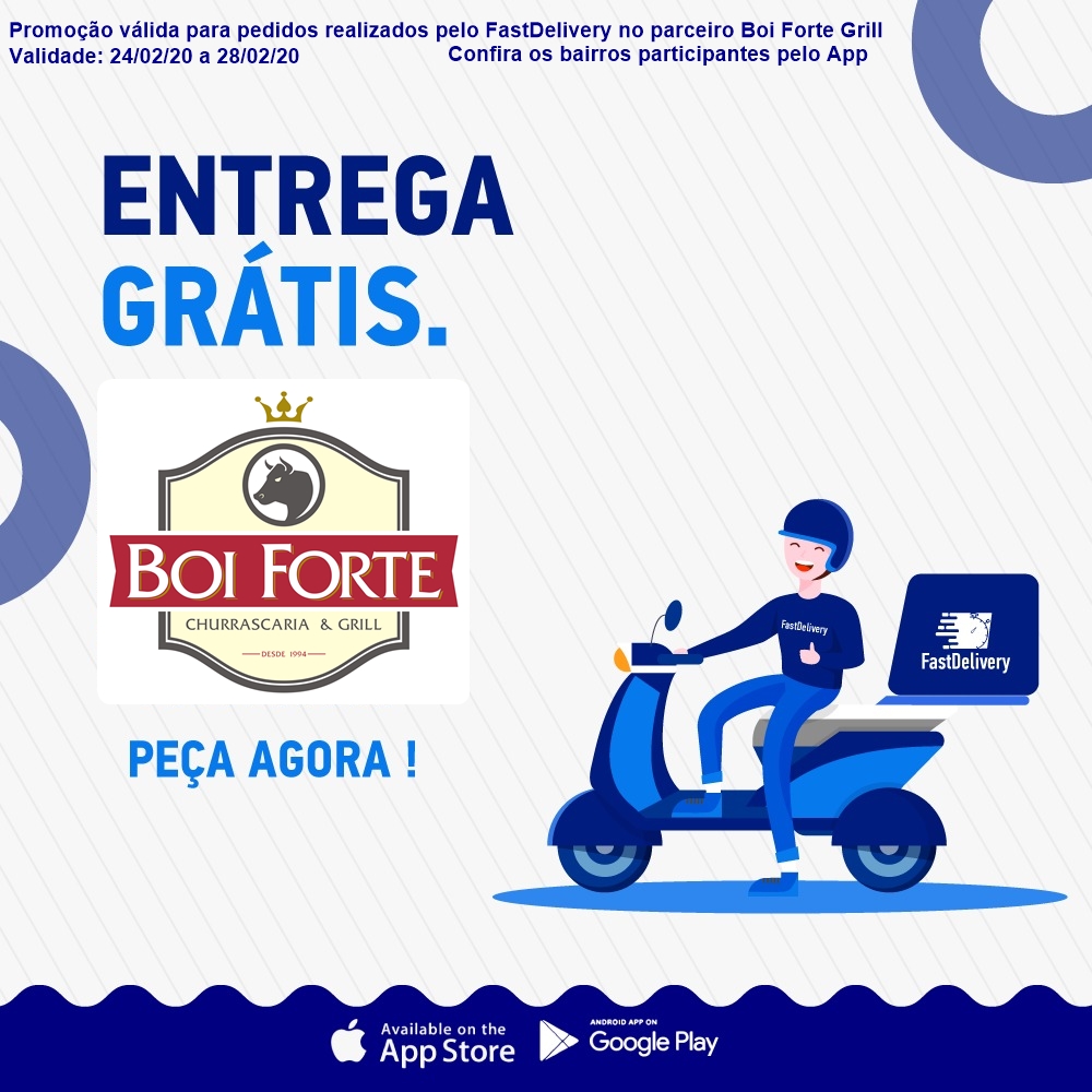 O aplicativo FastDelivery e seu parceiro Boi Forte Grill oferecem TAXA DE ENTREGA GRÁTIS para pedidos realizados pela plataforma FastDelivery.