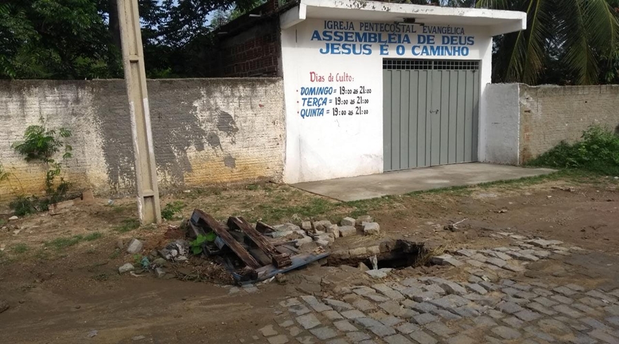Moradores estão reclamando que o calçamento da Rua Zacarias de Oliveira, em frente à Igreja Pentecostal Evangélica Assembleia de Deus, no bairro Nova Conquista (Mutirão), em Patos, está afundando pela quarta vez.