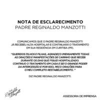 “Comunicamos que o padre Reginaldo Manzotti já recebeu alta hospitalar e continuará o tratamento em sua residência em Curitiba, no Paraná”, diz a nota.