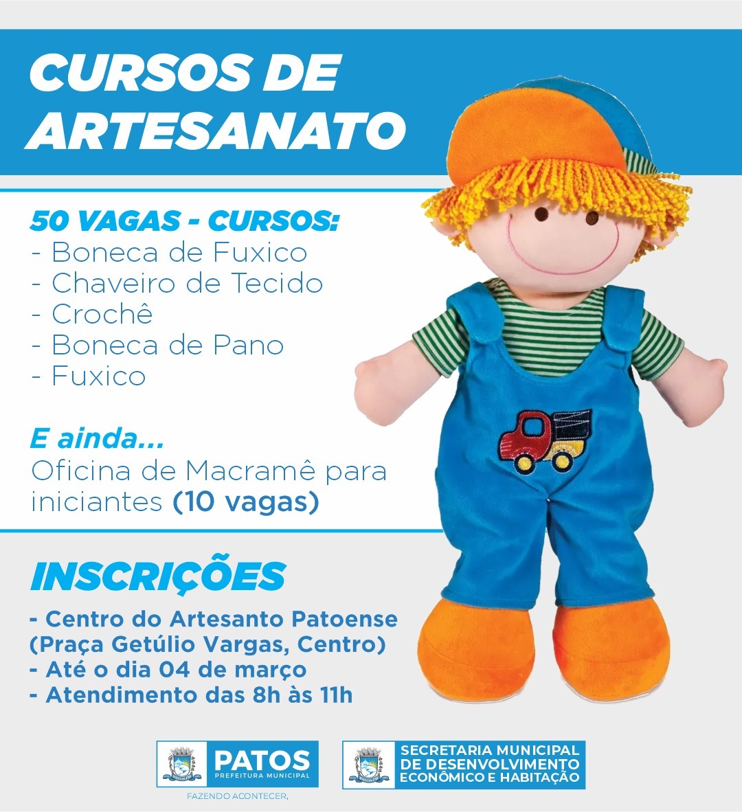 Com o resgate do São João de Patos que além de ser o principal evento da cidade, também é onde ocorre a maior circulação de capital bruto no município, e visando a qualificação profissional de muitos patoenses que têm no São João a sua principal fonte de renda no ano com o artesanato, a Prefeitura Municipal, por meio da Secretaria de Desenvolvimento Econômico e Habitação, lançou o edital 01/2020, para a realização de Cursos de Qualificação Profissional na área de artesanato com 60 vagas.