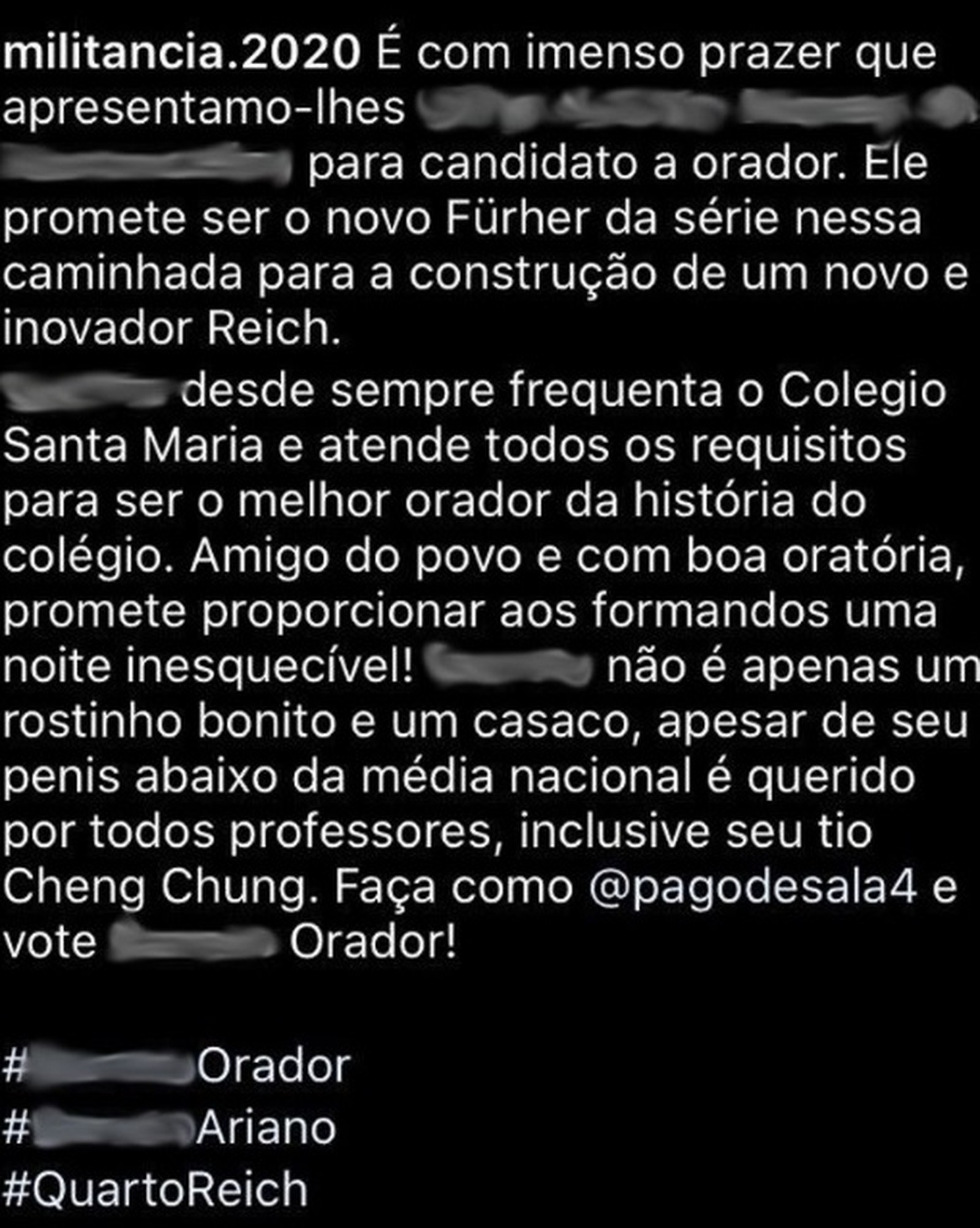 No texto, o jovem é apresentado como interessado em ocupar o cargo de orador e usa expressões que ficaram conhecidas pelos simpatizantes de Adolf Hitler, chanceler da Alemanha, na guerra ocorrida no século 20. A conta em que a imagem foi postada foi removida da internet.