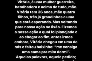 Vitória, que reside no bairro das Placas, é muito carente, procurou o grupo e pediu ajuda. O grupo ficou bastante sensibilizado com a situação dela e começou uma campanha para ajuda-la. “Estamos fazendo uma campanha para essa família que trabalha no lixão. Ela é Vitória, tem 37 anos, está grávida do seu quarto filho e não tem nada em casa. Já conseguimos uma cama, ventilador e algumas roupas para o bebê, que está chegando”, disse Maria Gioneide, integrante do grupo.