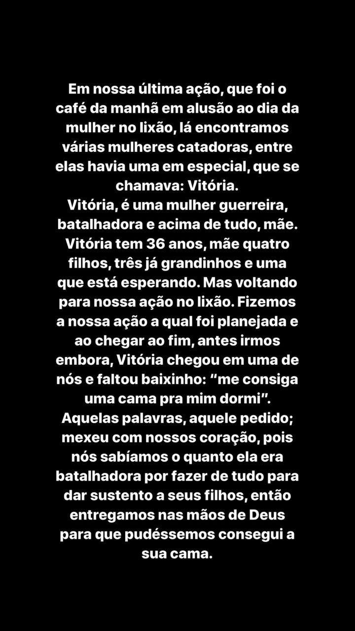 Vitória, que reside no bairro das Placas, é muito carente, procurou o grupo e pediu ajuda. O grupo ficou bastante sensibilizado com a situação dela e começou uma campanha para ajuda-la. “Estamos fazendo uma campanha para essa família que trabalha no lixão. Ela é Vitória, tem 37 anos, está grávida do seu quarto filho e não tem nada em casa. Já conseguimos uma cama, ventilador e algumas roupas para o bebê, que está chegando”, disse Maria Gioneide, integrante do grupo.