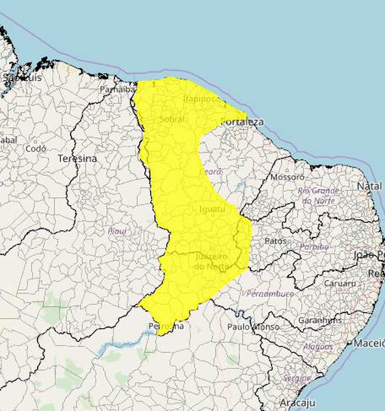 O Instituto Nacional de Meteorologia (Inmet) emitiu um alerta amarelo de perigo potencial de chuvas intensas para 26 municípios do Sertão da Paraíba. O aviso foi emitido às 16h06 desta segunda-feira (9) e dura até as 10h da terça-feira (10). Entre as cidades estão Cajazeiras, Sousa e Triunfo.